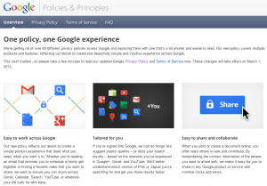 As of March 1, 2012, Google will be replacing its 60+ privacy policies with one. In an effort to try and simplify terms for users to better understand, all the Google services’ policies will be combined into one. Google’s new, shorter privacy policy will allow them to share users data across their applications (YouTube, Gmail, etc).